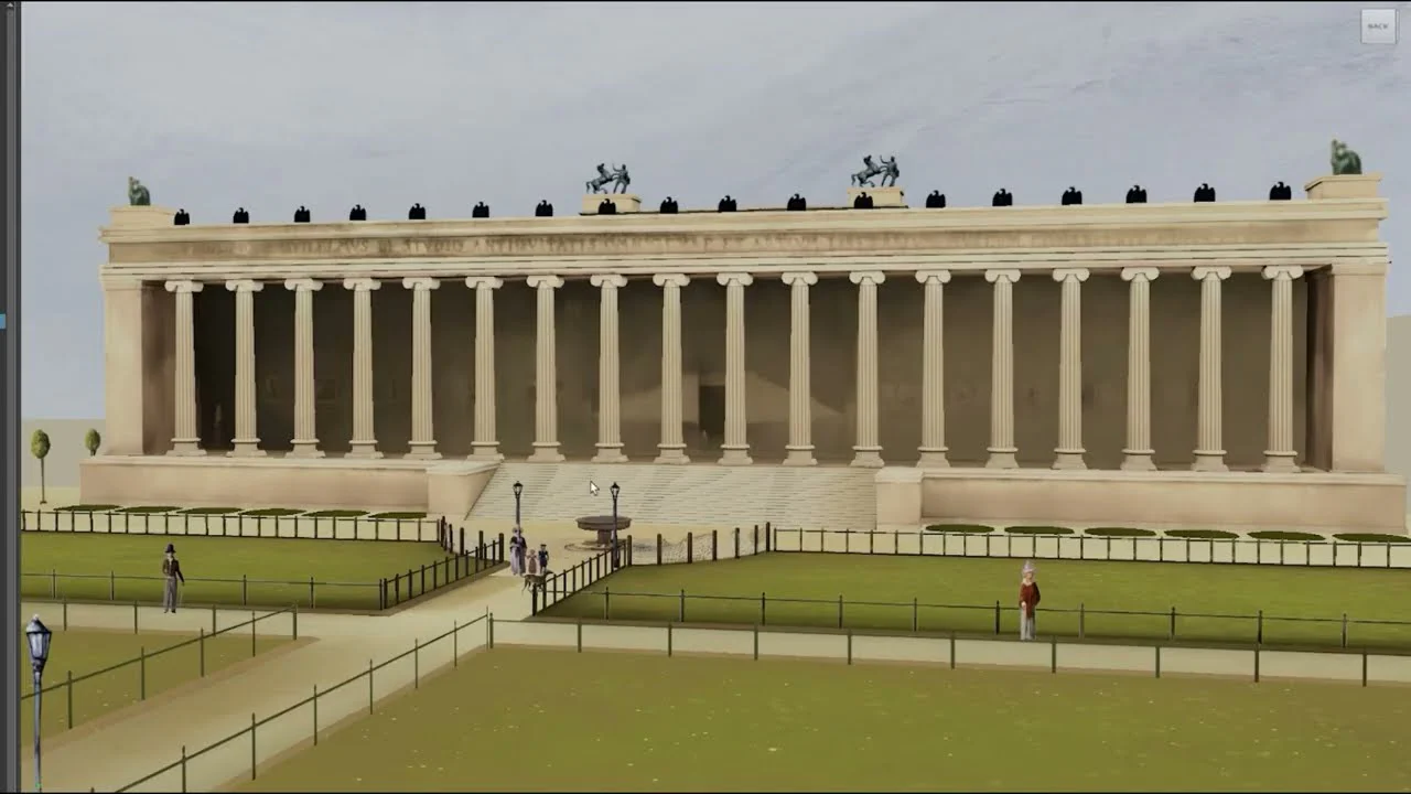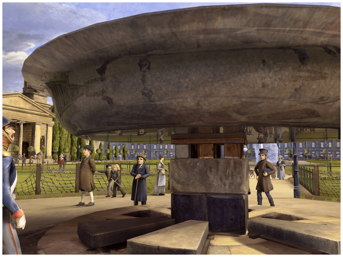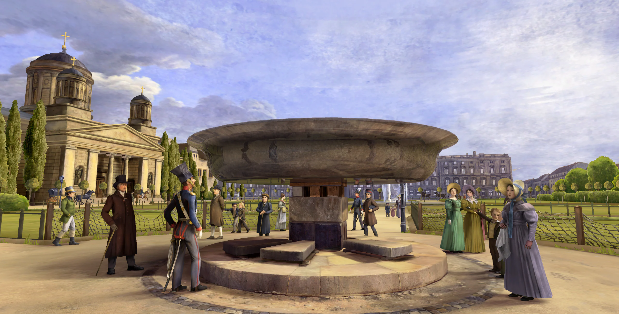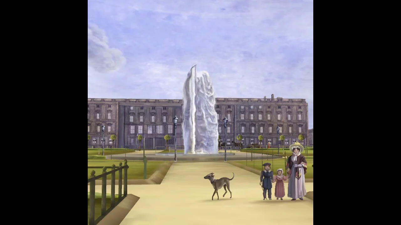 The painting and elements not visible in the painting like the museum or trees have been entirely reproduced in 3D by our 3D artists. It involved placing volumes, hand painting all the content, creating from historical documents missing parts, modeling all near characters and generating impostors for far characters.