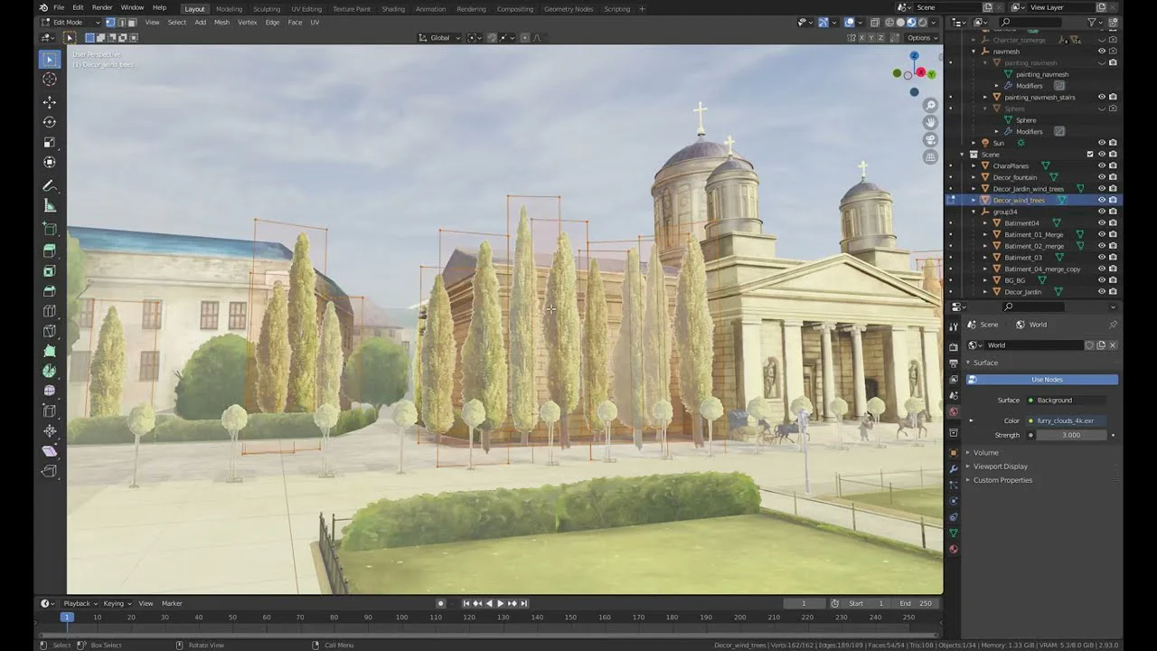 We added wind by rotating the sky dome and making trees move. Since trees are impostors and therefore simple planes we can add local displacement using the tangent of the face to make it move.