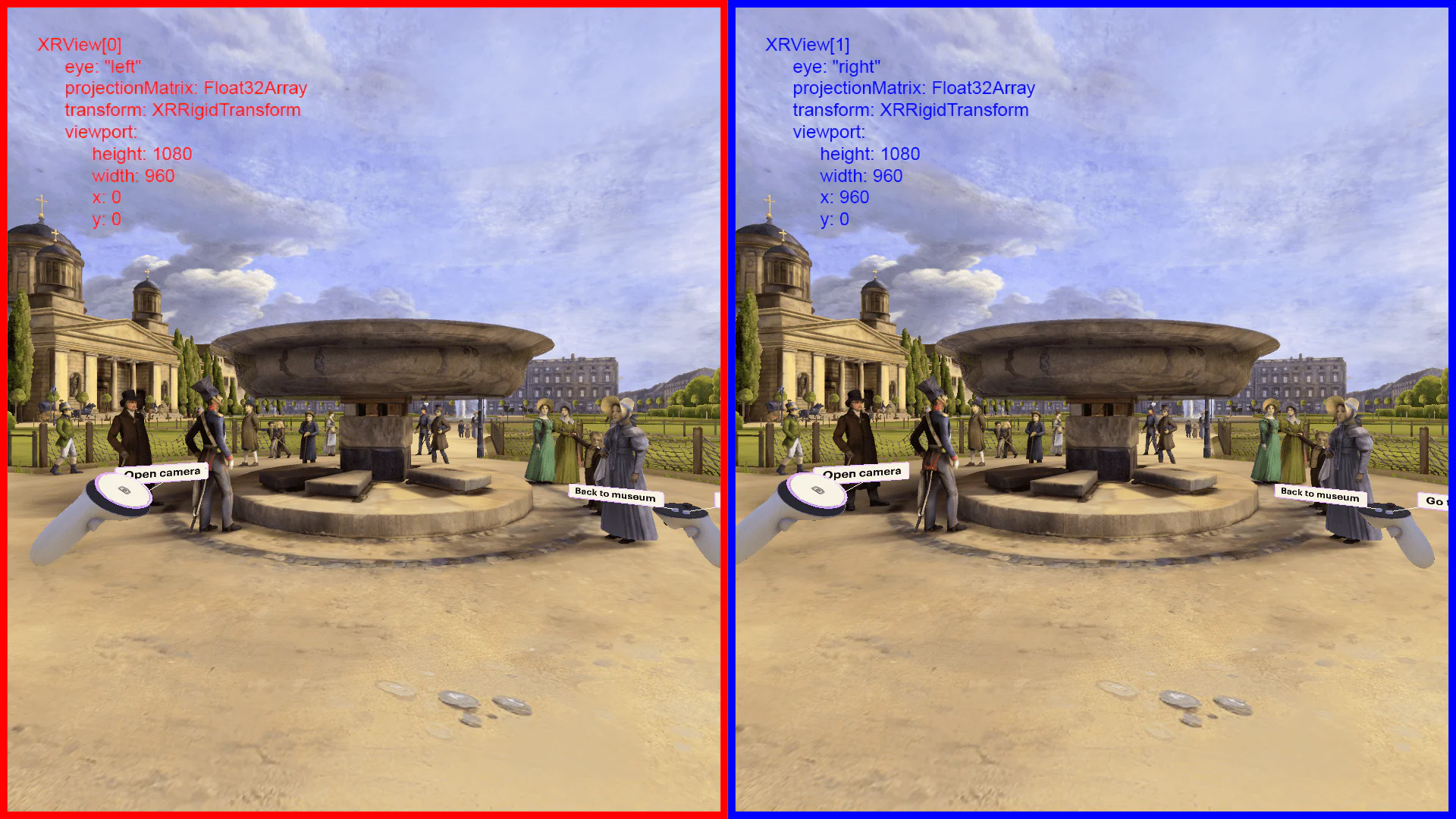 WebXR is the new standard to handle virtual reality within a browser (previously called WebVR but has become WebXR to handle augmented reality or any other reality as well). If you are not familiar with the concept, to present a VR frame to the viewer, the scene has to be rendered twice, one for each eye. The WebXR api returns the rendering informations for each eye, transform, projection, viewport and, if available, controllers/hand positions.