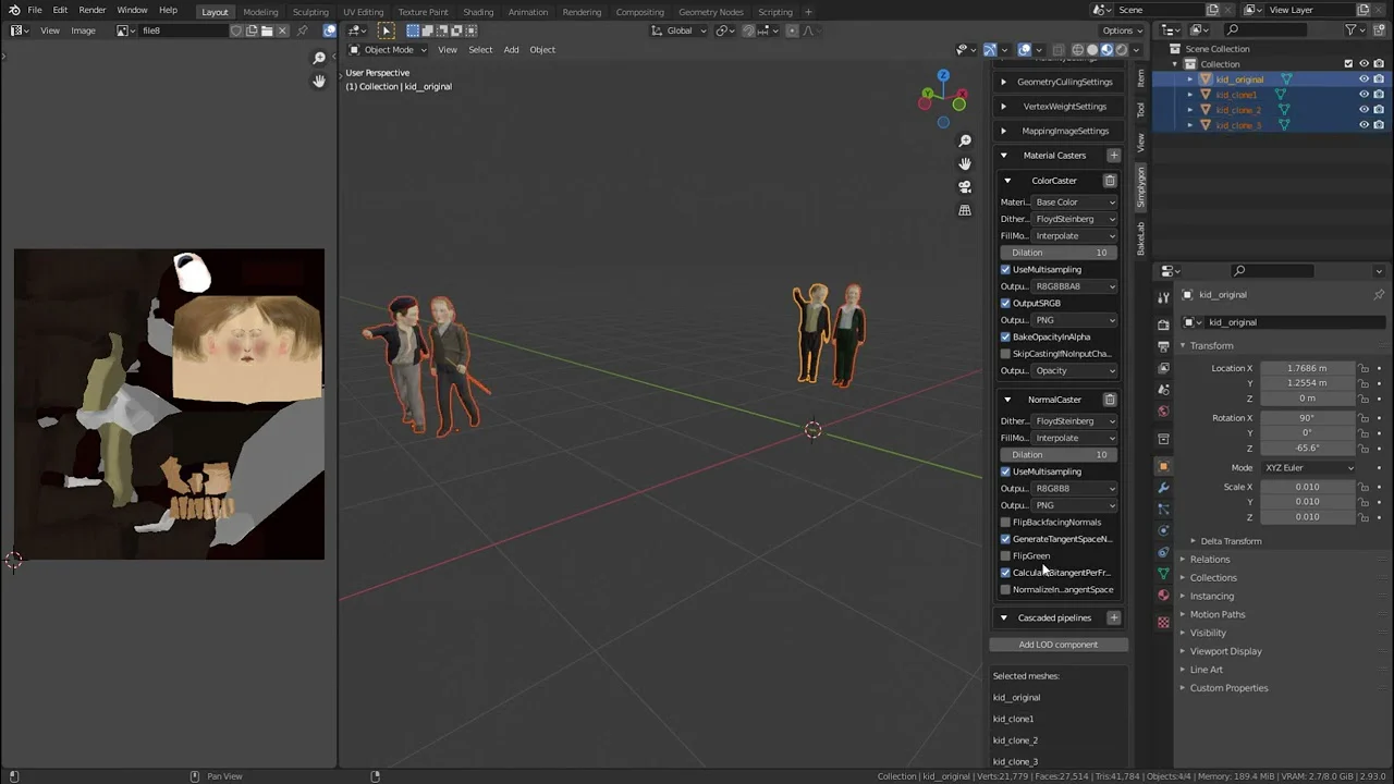 There are 16 characters in the scene (including the dog 🐶). Performance wise, we couldn’t afford two textures (normal, albedo) per character and complex shading. To reduce textures and draw call count we used Simplygon to aggregate characters. Beside other features it can merge selected mesh, generates a new uv set and creates new textures based on sources according to the new uv set.
