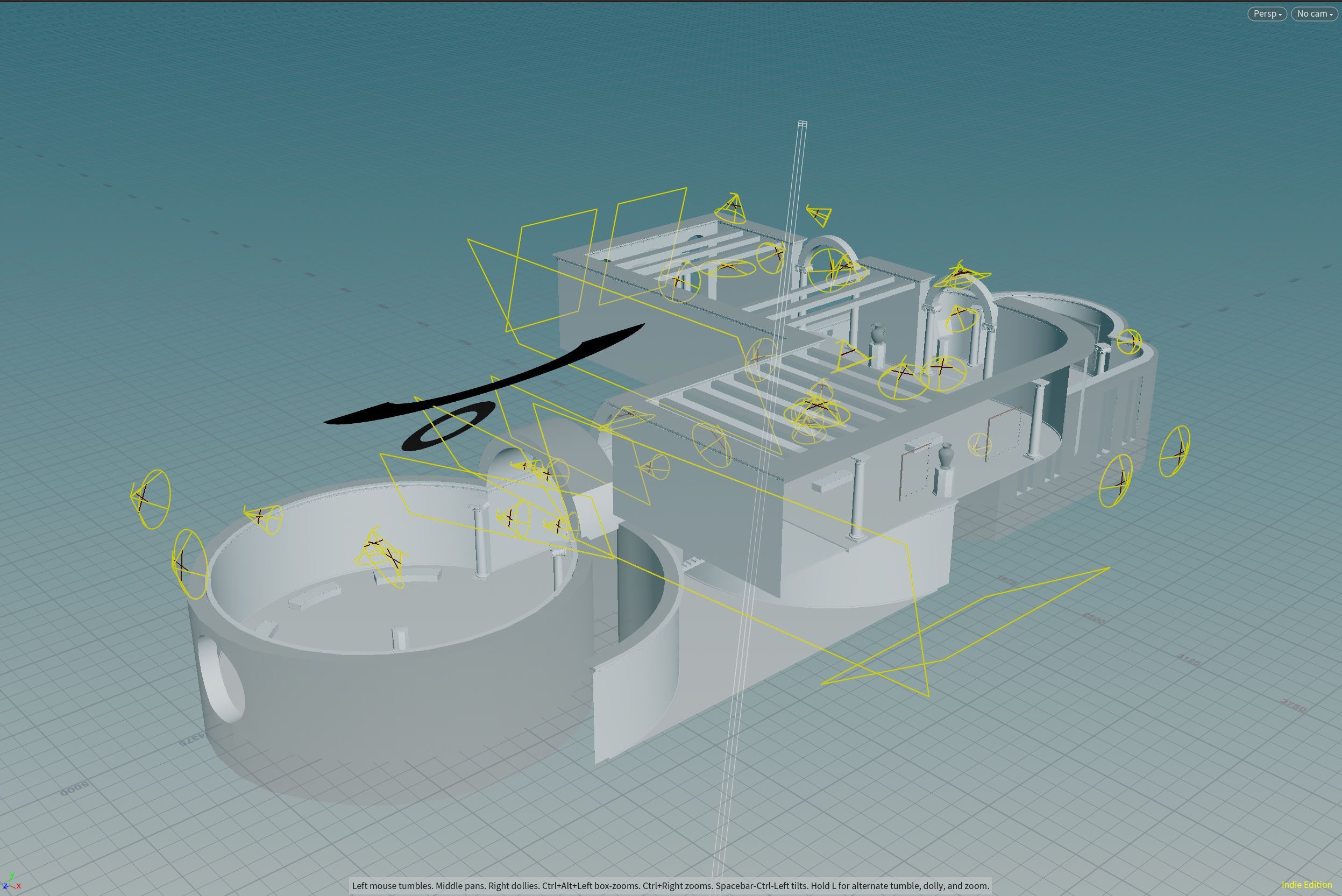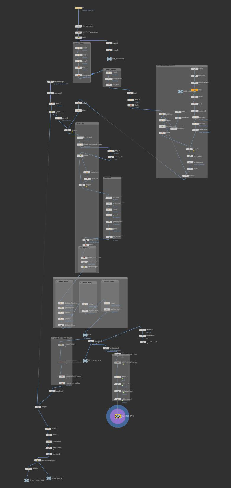 Our vision of the museum was to create large dreamy rooms with beautiful lights and colors. The museum relies a lot on lightmap, baked using Houdini. Houdini uses a non destructive workflow to generate on the fly lightmap uv with good texel density scattering, which is great for quick iterations. And since it’s node based, it enables other things, like, cleanup the scene, add and place interactible frames, generate the navmesh used in XR mode, color some part of the scene and more... all at once.