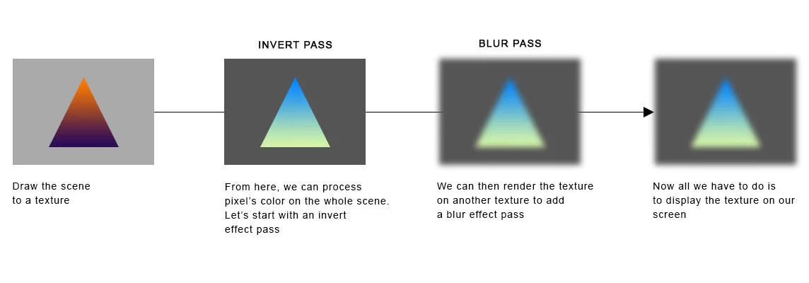 But there are performance drawbacks with this as soon as you have multiple effects (and multiple FBOs), especially on mobile. Therefore, a good practice is to merge, as much as possible, the effects in one pass: