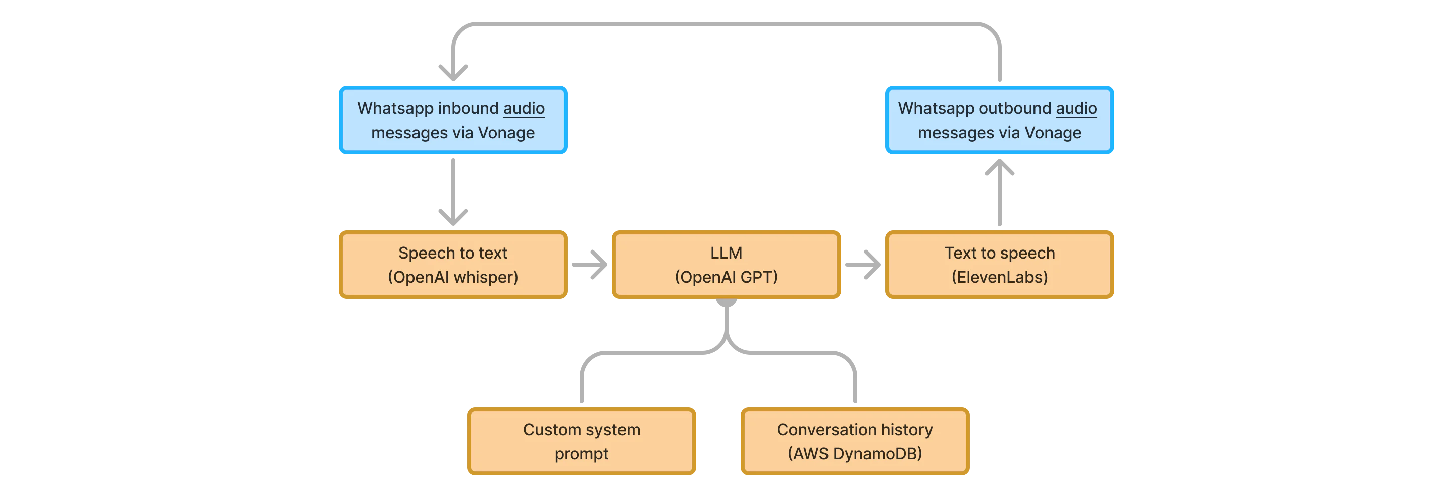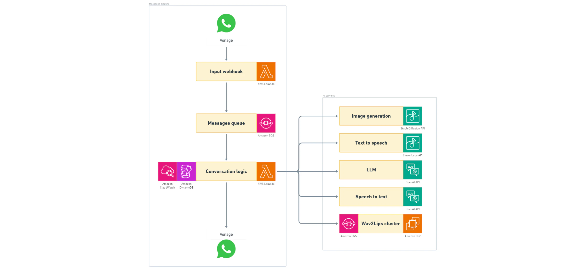 Incoming messages are sent by Vonage to a webhook connected to a lightweight AWS Lambda function that verifies integrity and transmits messages to an SQS FIFO queue. A separate Lambda function, which is the core of the application, processes messages in batches of 10.