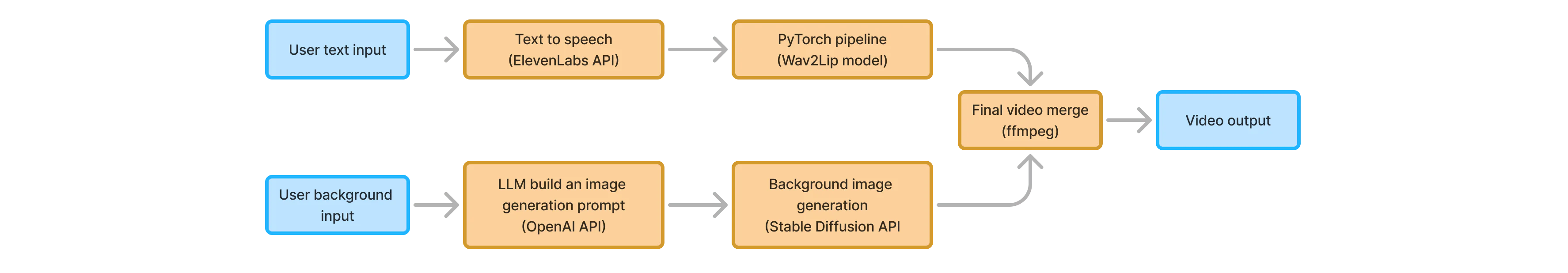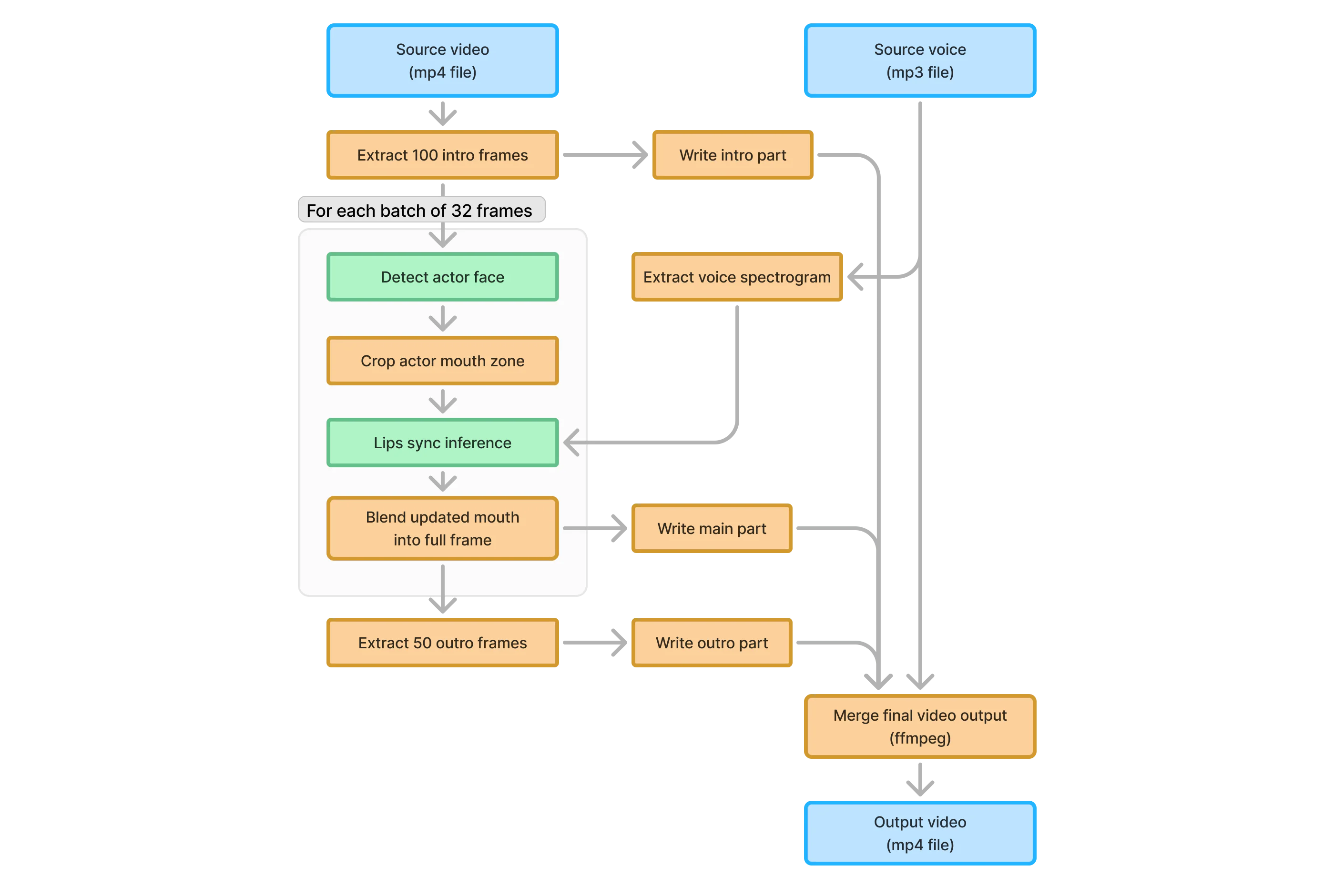 Up to the "Crop actor mouth" step, previous ones always produced the same results, so we decided to precompute these steps. The remaining steps could not be precomputed as they depended on the dynamic, user-provided inputs. Additionally, we moved the final video encoding process to the GPU, using the h264_nvenc encoder with ffmpeg to reduce CPU load.